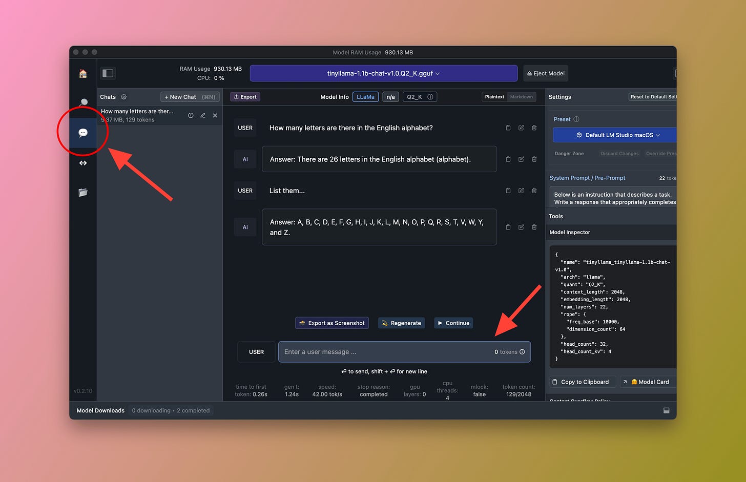 Load and chat — Once downloaded, load the model in the chat interface. It runs 100% locally. You can also enable a local API server if you want to connect other tools or apps to it.